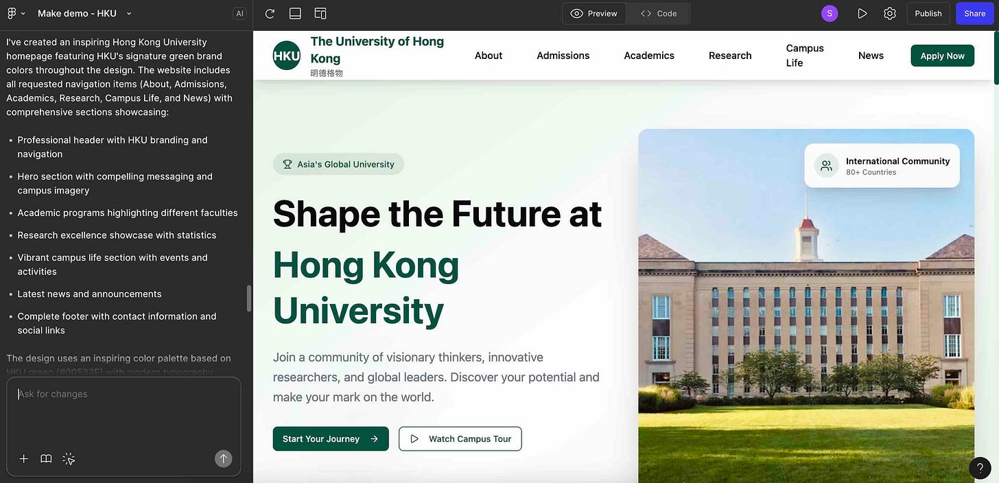 저도 “레코드가 빙글빙글 돌아가는 재즈 음악 플레이어를 레트로풍으로 디자인해줘” “홍콩 대학의 웹사이트를 만들어 줘”와 같은 부탁을 해 보았는데요. 아직 솜씨가 꽤 좋지는 않았습니다. 디자인 퀄리티는 상당히 구식이었고, 사용한 템플릿도 식상한 것이었습니다.